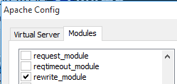 Apache Config window consists of two tabs; Virtual Server and Modules.
